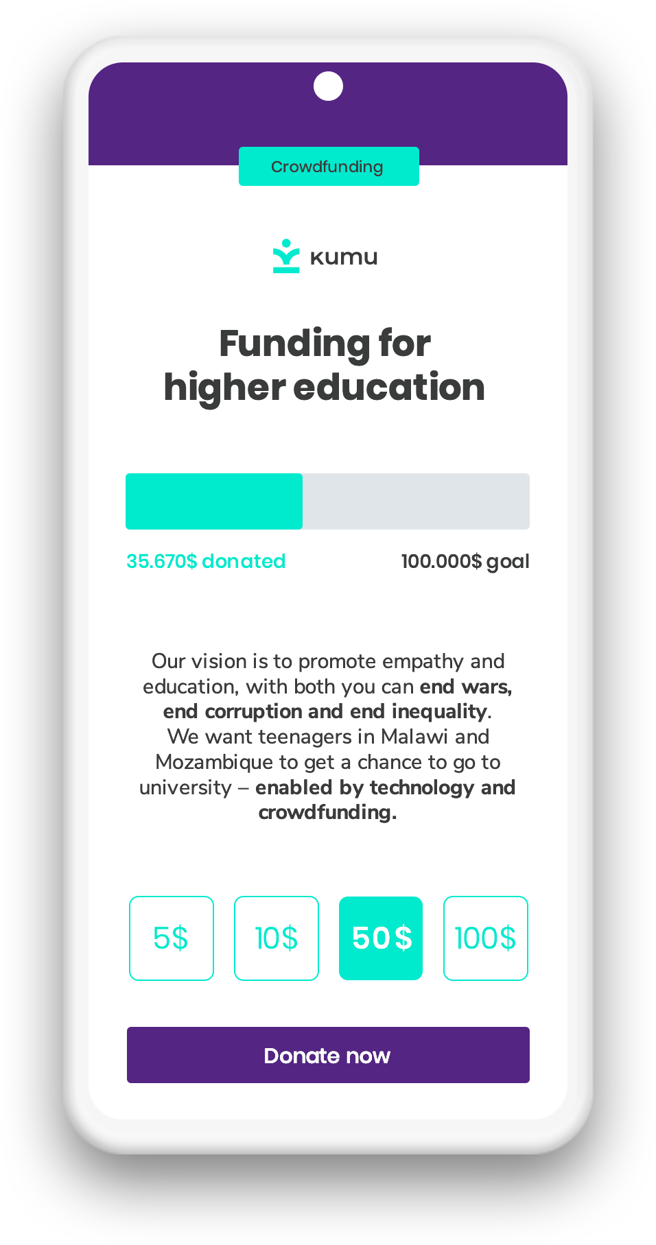 Our platform allows kids in Africa to get sponsorships from those who want to help and mentor them throughout their educational journey. After the initial application of both, the donors and students, KUMU’s goal is to match them based on interests, education and professional career goals. Via the app people are able to donate to cover the students’ education, accommodation and food.